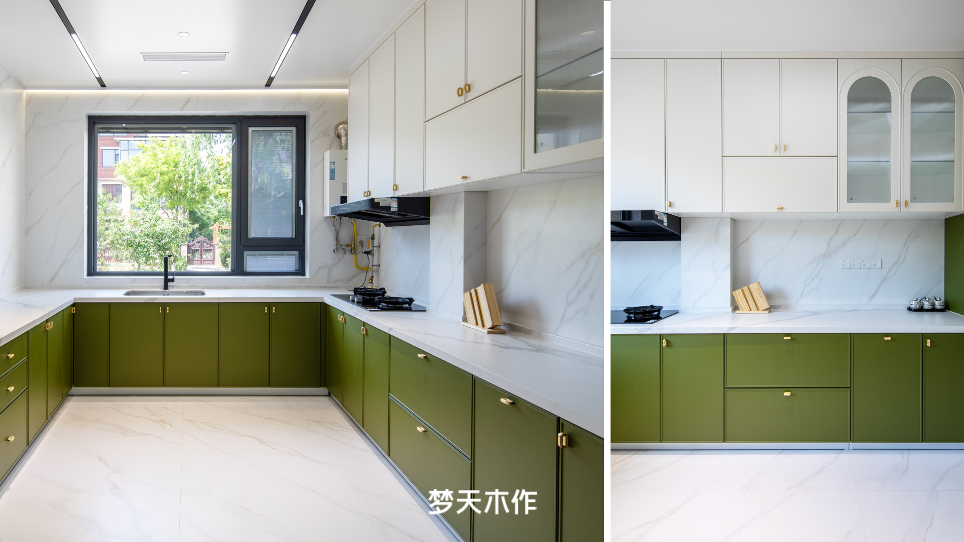 厨房空间采用三面橱柜环绕墙面形成U型结构,宽绰的操作台以科学的动线减少体力损耗,让美食的制作亦温馨有趣。