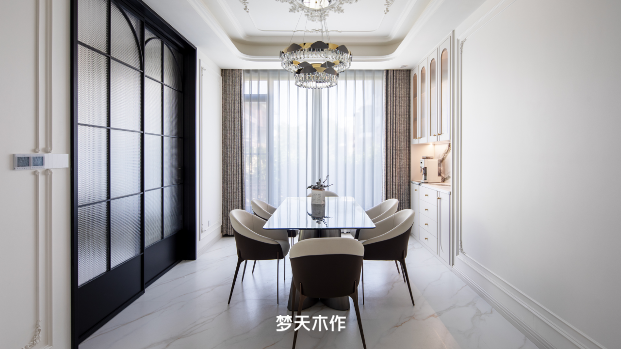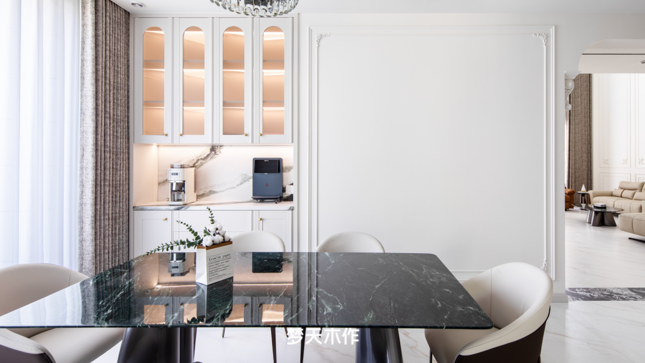嵌入式法式餐边柜,一体化定制,双廊柱柜门搭配圆弧玻璃,尽显优雅。加以氛围灯光的衬托,使得气场被无限地放大,凭借其多元化的功能,完美契合高品质的生活理念,为家居生活增添一抹浓郁的法式风情。