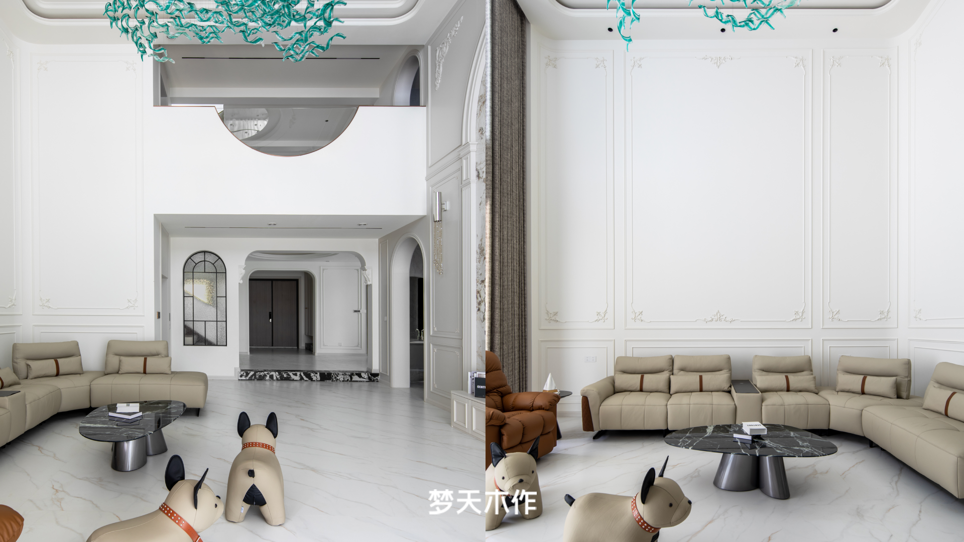 本案为420m²独栋别墅,法式风格弥漫着复古、自然主义独特韵味,散发着舒适、优雅、安逸的迷人气质。没有夸张的造型,亦无强烈的视觉冲击,元素相互交织、映衬,使整个空间呈现出一幅恬淡、浪漫的的法式庄园画卷。