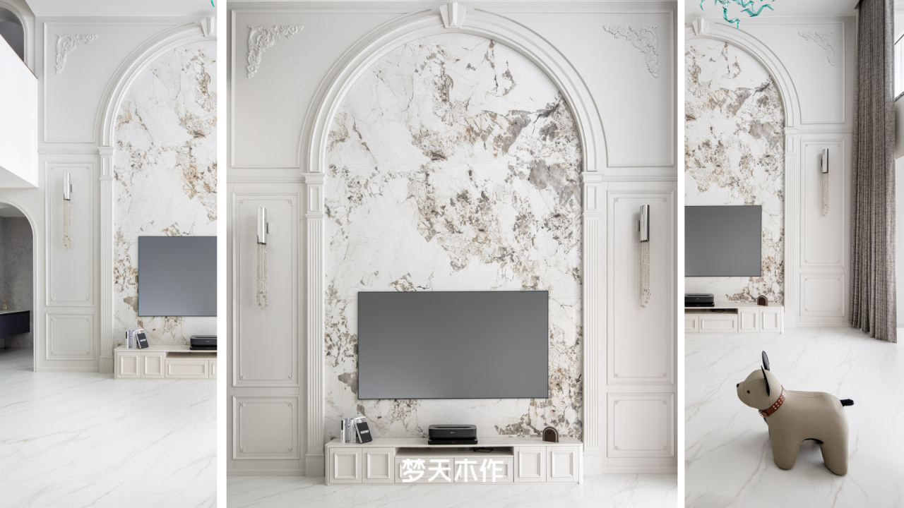 电视背景墙布局上突出轴线的对称,恢宏的气势。细节处理上运用了法式廊柱、雕花、线条,制作工艺精细考究。点缀垂直窗帘、大理石、不锈钢金属的运用使色彩与内在空间产生联系。挑空式的空间结构,让所有一切的浪漫气息扑面而来。