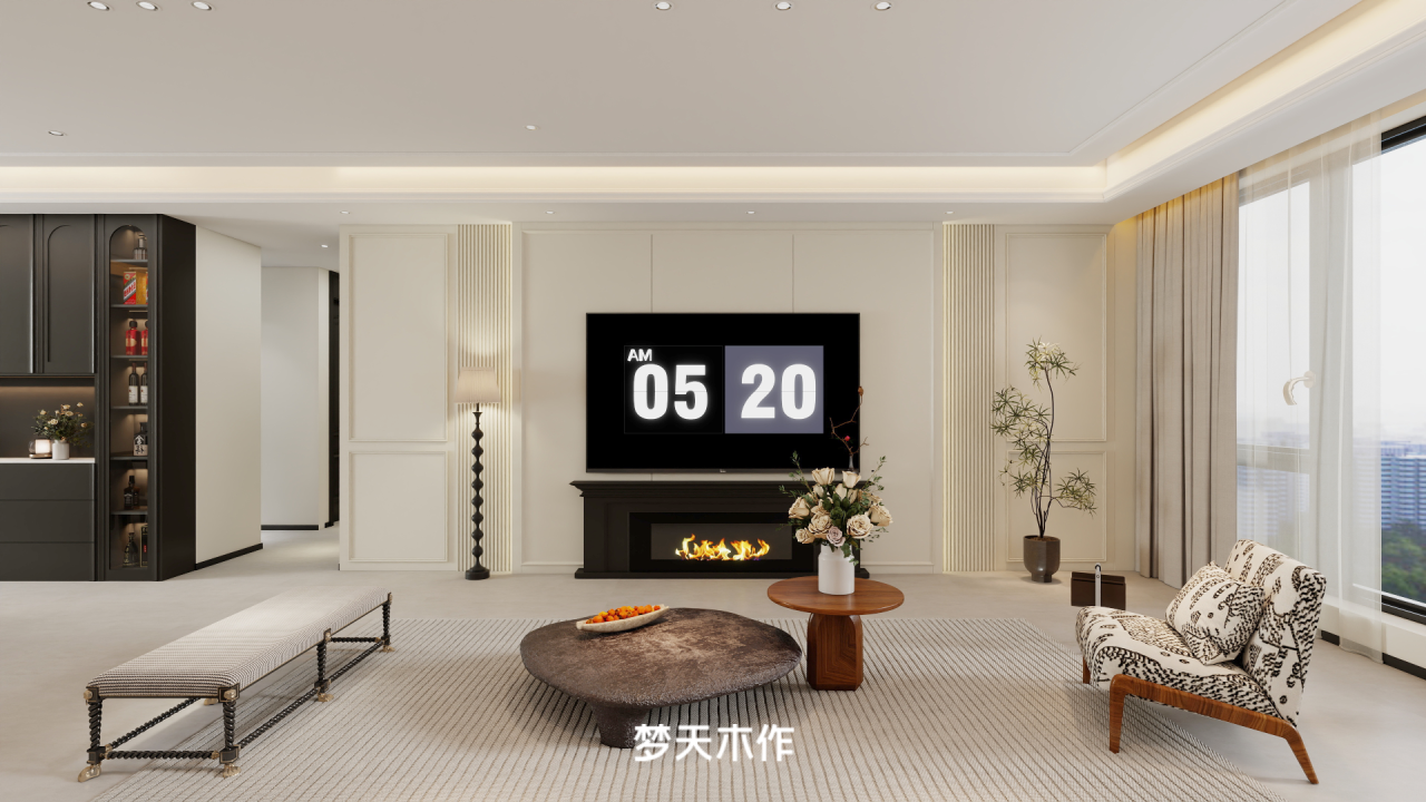 步入客厅,自然气息迎面而来,回家的心情得以转化与放松。观景玻璃窗给予空间开阔的视野,电视柜贯穿整面墙,带来线条的连续和伸展。家具的摆放遵循实用的原则,简单且更具可移动灵活性,填补了简约的留白,丰富空间的气质,通透而舒适。