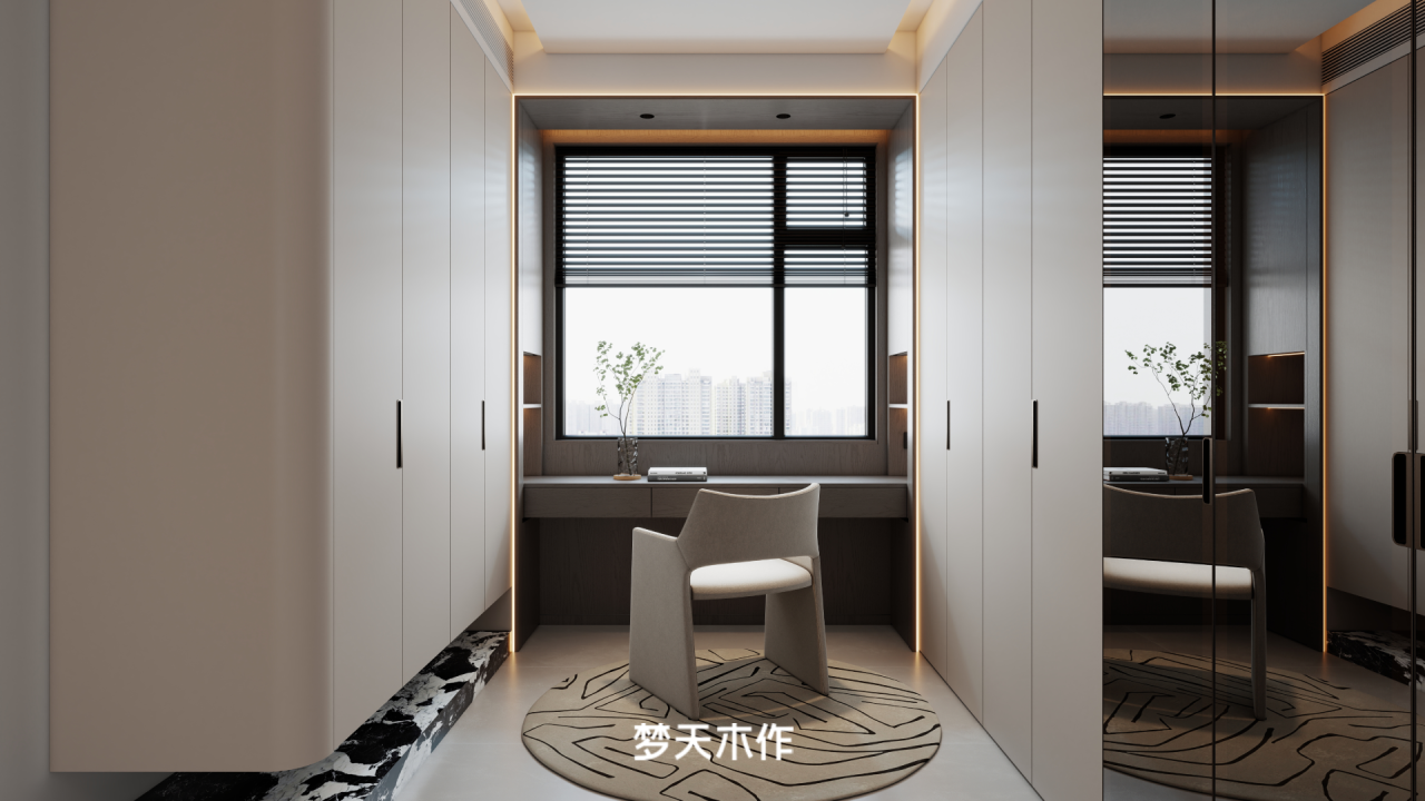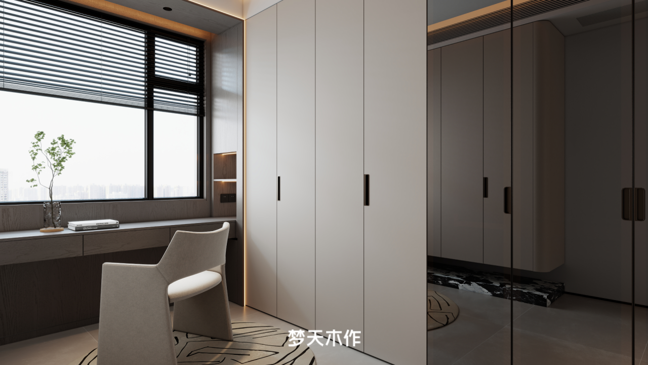 衣帽间如私藏的艺术回廊,以朦胧笔触勾勒出休憩的仪式感。采用暖色调的星辰灰+玻璃质感一体化设计衣柜,凸显出随手拈来的优雅与庄重感。柜体封闭与开放模块的有效搭配、组合,消除小空间所带来的压迫感,成就每一处细节皆惊喜的生活乐趣。