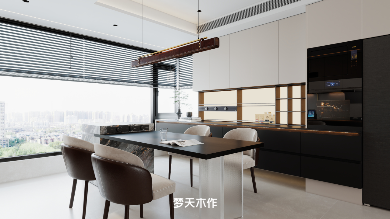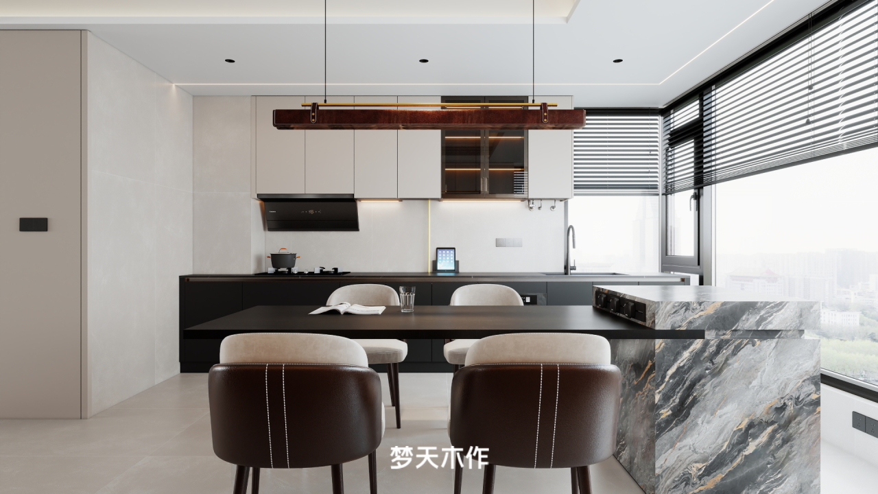 中式餐厨空间为家宴而构建,多功能岛台打破传统分类,雕饰空间中心的同时协调着此处空间的社交场。