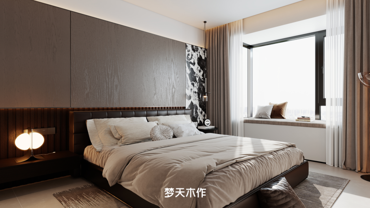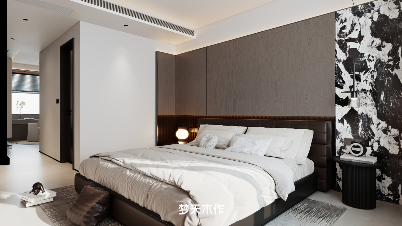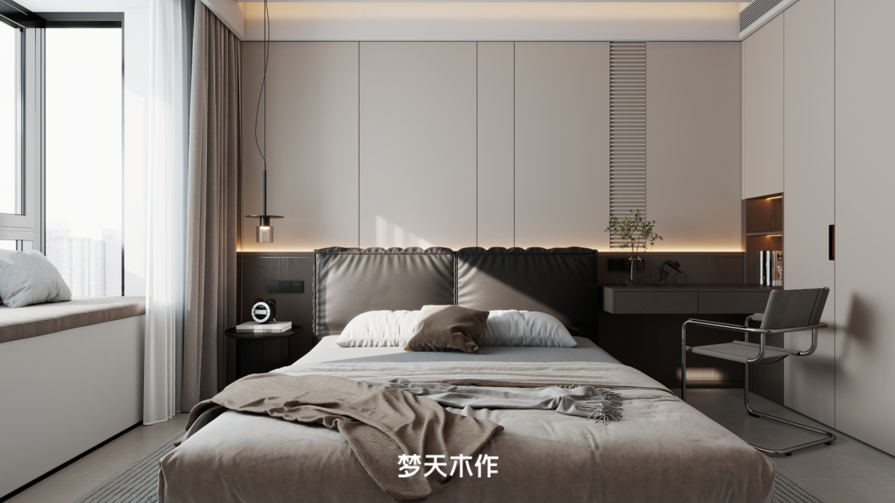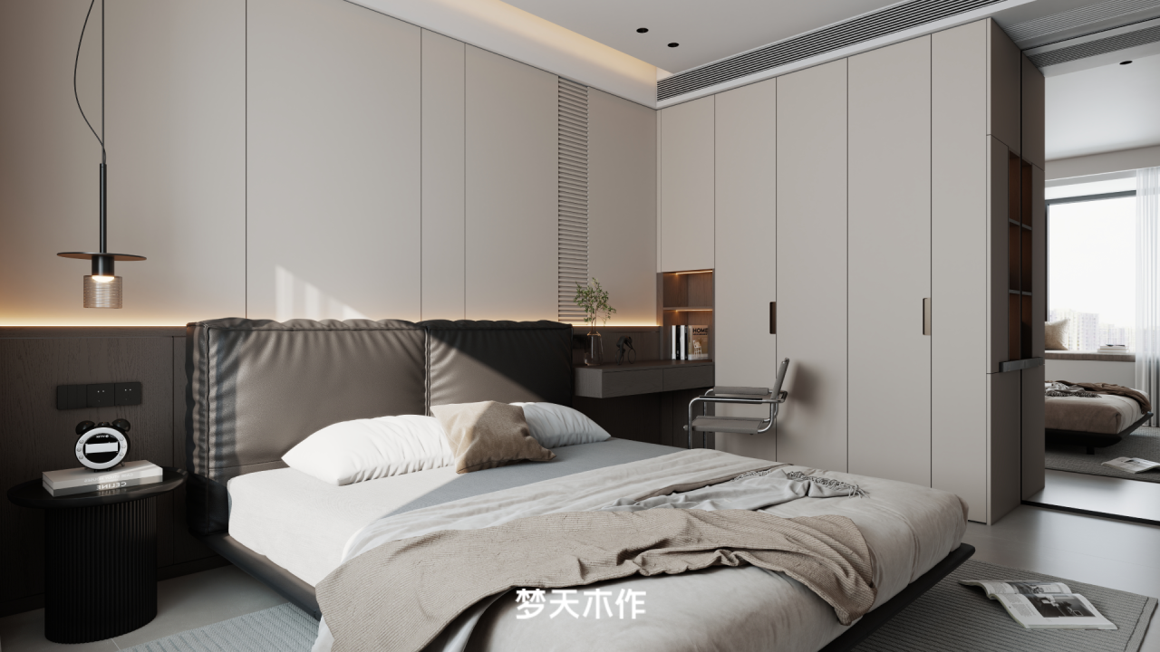 走进次卧,曲径通幽,豁然开朗。通顶一色柜体,床头柜(办公区)藏于柜体延伸处,于层叠错跃间流动开来。整体以舒适感为重点,在材料语言上更突出温馨与淡雅的氛围,通过舒适感的床品摆件和灯光营造松弛的寝居体验。