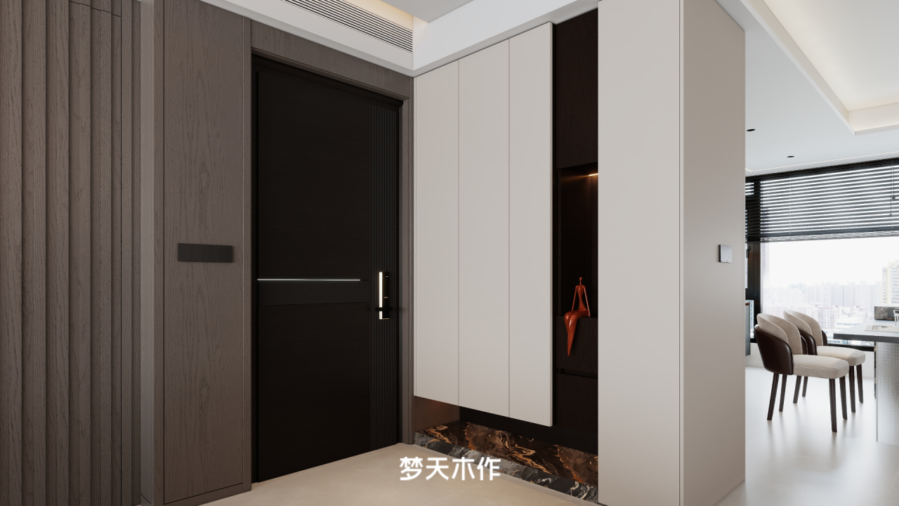 入口处的端景,化解进门“一览无余”的尴尬。沿墙设计一门到顶的玄关柜,木质线条的加入,令空间更具灵动美感,简洁大气又便于日常收纳。