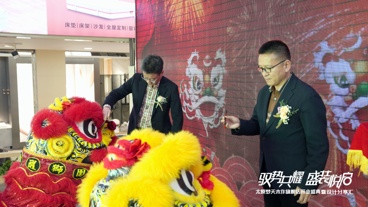 狮舞祥瑞到,鼓响福运隆。良辰吉时,梦天家居总经理余静滨与承德、太原梦天木作总经理谢凯泽共同进行点睛仪式,为太原梦天木作旗舰店的美好新征程拉开序幕。