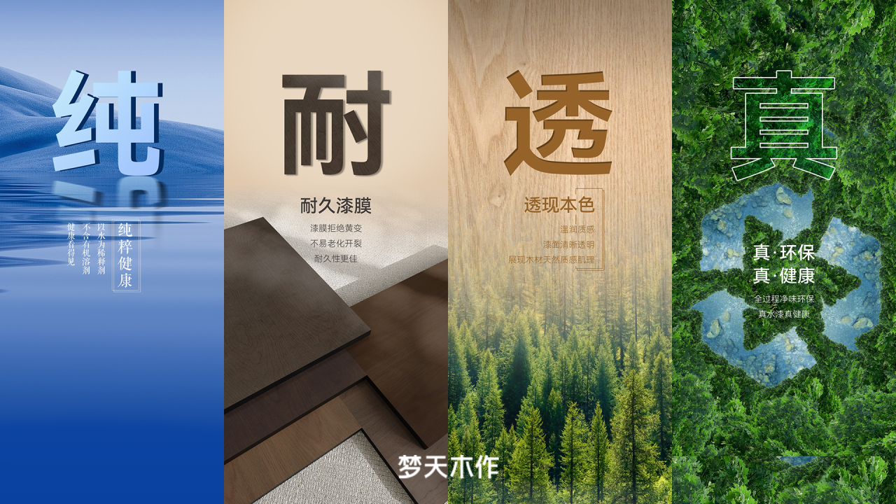 一改传统油漆用天拿水为稀释剂的方法,梦天家居升级以水为稀释剂,具有“纯、耐、透、真”属性,不含有机溶剂,漆膜拒绝黄变、不易老化开裂、耐久性更好,整体漆面通透展示自然木材的木纹肌理、质感,给人带来温润柔和的触感体验。从装修源头解决消费者痛点,守护家人健康,一经面世便受到了行业与广大消费者的认可与坚定选择。